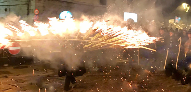 Optoget slutter ved en stor plads, hvor faklerne smides på et kæmpe bål.