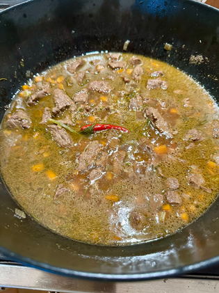 • 500–1000 g vildsvinekød skåret i tern á 3–4 cm