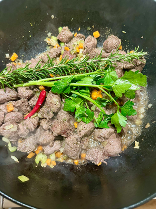 Tilsæt soffrittoen igen sammen med salt, peber, oregano, rosmarin, laurbær, persille og evt. chili.