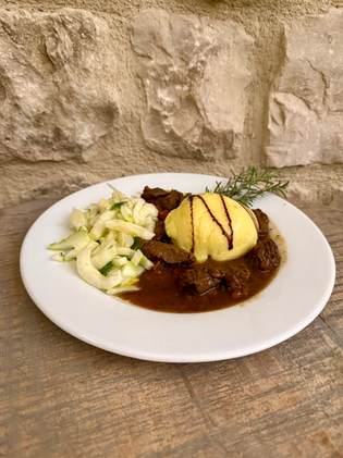 Her braiserer vi vildsvinet i vores egen SOGNO – Engelsk Barley Wine, som med sin dybe maltfylde og vinøse noter giver retten varme, sødme og kompleksitet. Retten kan også laves med rødvin eller en god bouillon – men øllet giver den noget helt særligt.